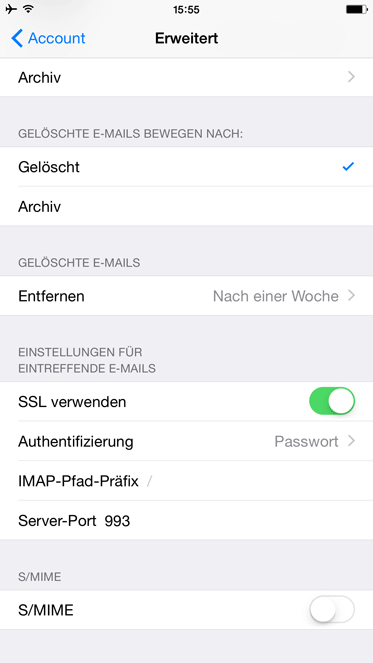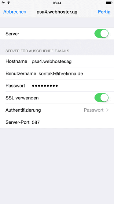 In den erweiterten Einstellungen sollten Sie zur Sicherheit nochmals überprüfen, ob Sie bei Ihrem Posteingangsserver (IMAP) auch die SSL-Verschlüsselung aktiviert haben. Nur mit einer aktivierten Verschlüsselung kann Ihr iPhone die E-Mails von Ihrem Account abrufen. Mit einer einfachen Berührung aktivieren Sie die SSL-Verschlüsselung. Im nächsten Schritt sollten Sie sicherstellen, dass auch bei Ihrem Postausgangsserver die Verschlüsselung aktiv ist. Wählen Sie im darunterliegenden Feld „Authentifizierung“ als Methode „Passwort“ aus. Für den Versand Ihrer E-Mails verwenden Sie den Port 587.