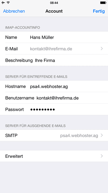 Nun müssen Sie die Serverdaten von Ihren E-Mail Account eingeben. Im Detail benötigen Sie für die iPhone-Einrichtung den Hostnamen, einen Benutzernamen und ein Passwort. Alle nötigen Informationen entnehmen Sie bitte Ihren Zugangsdaten. Diese haben Sie bereits von uns erhalten. In das Feld „Hostname“ tragen Sie die Webadresse des Servers ein. Im Feld „Benutzername“ tragen Sie einfach Ihre E-Mail-Adresse ein. Es handelt sich um dieselbe Kombination aus Benutzername und Passwort, mit der Sie sich auch im Internet in Ihren E-Mail Account einloggen können. Tragen Sie bitte alle Daten auch in das darunterliegende Feld „Server für ausgehende Mails“ ein. Klicken Sie im Anschluss auf „Erweitert“.