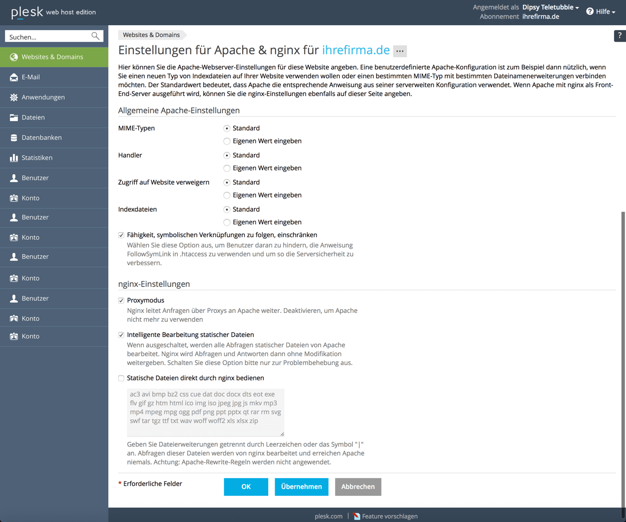 Hier finden Sie alle wichtigen Einstellungsmöglichkeiten Ihres Accounts. Sie können hier weitere Domains, Subdomains, oder Aliase hinzufügen. Für jede Domain erhalten Sie eine eigene eigene Auflistung wie in diesem Beispiel für die Domain ihrefirma.de.
