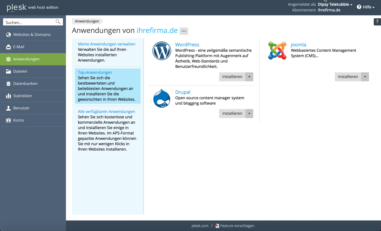 Plesk bietet viele Applikationen an die Sie mit ein paar Klicks installieren können. Das System läd dann direkt vom Hersteller die aktuellster Version herunter und passt sie dem Webhosting Account an. Sie können, wenn Sie auf den kleinen Pfeil neben dem „Installieren“ Button klicken eine benutzerdefinierte Installation durchführen und ein paar Angaben treffen die direkt mit eingestellt werden sollen. So zum Beispiel die Datenbankbezeichnung, das Kennwort oder den Pfad in Ihrem Webspace wo die Anwendung installiert werden soll. Wir empfehlen die Anwendung immer im Hauptverzeichnis der Domain zu installieren, damit Sie nicht erst noch Umleitungen einrichten müssen. Wenn Sie mehrere Anwendungen installieren wollen, legen Sie doch einfach eine Subdomain an und installieren Sie die Anwendung dann dort.