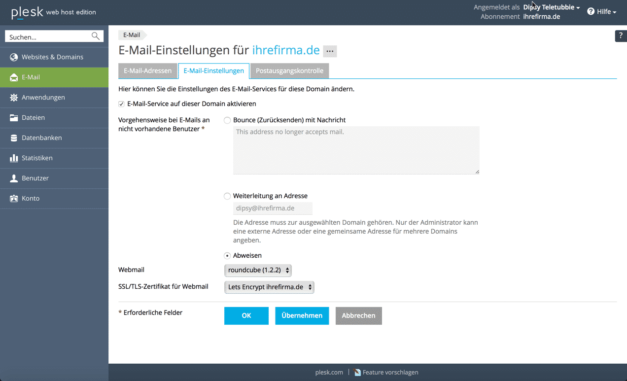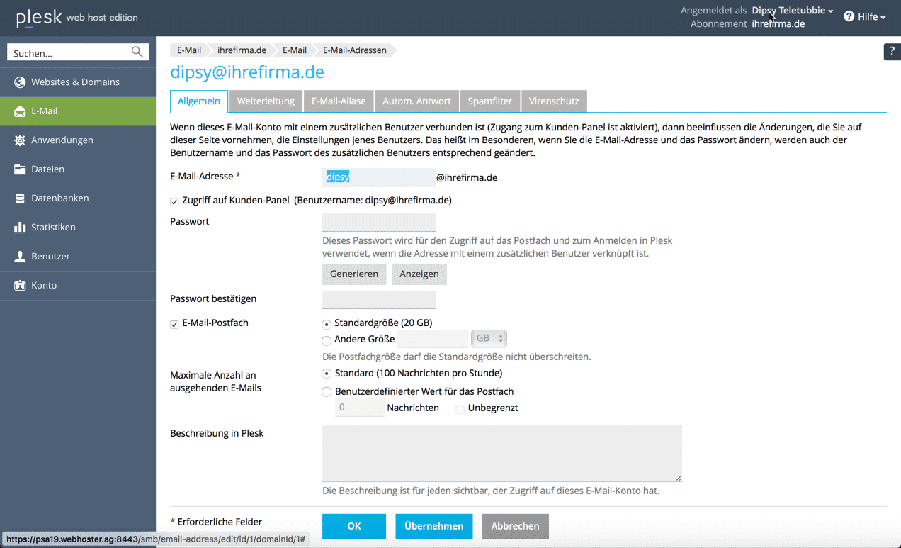 Die eMailfunktionen sind sehr umfangreich. In diesem Menü können Sie die Größe des IMAP/POP3 Postfachs verändern, die Anzahl der Nachrichten die Sie in der Stunde versenden dürfen (Spamschutz), das Passwort verändert, oder eine eMailweiterleitung definieren. eMails werden immer im Postfach selbst gespeichert, welches der eMailadresse entspricht. In diesem Beispiel lautet das Postfach dipsy@ihrefirma.de. Es ist über das IMAP oder POP3 Protokoll abrufbar.