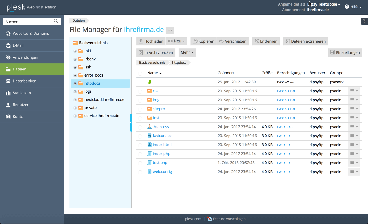 Mit dem Plesk eigenen Dateimanager können Sie ganz leicht Dateien auf den Webspace hochladen, bearbeiten oder kopieren. Es besteht auch die Möglichkeit mit Zip gepackte Dateien oder Verzeichnisse auf den Server zu laden und dann zu entpacken. Wenn Sie kein FTP Programm zur Hand haben können Sie so ganz leicht Ihre Dateien verwalten.