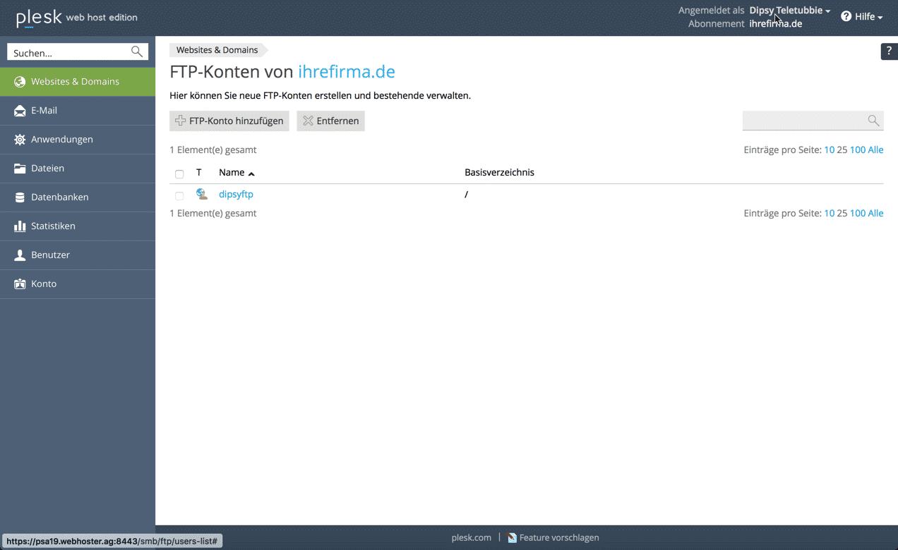 Anders als beim Webhosting Zugang können Sie hier den FTP Benutzer definieren und auch weitere FTP Benutzer anlegen um z.B. für eine bestimmte Domain einen separaten FTP Zugang direkt in das Verzeichnis der Domain zu ermöglichen.