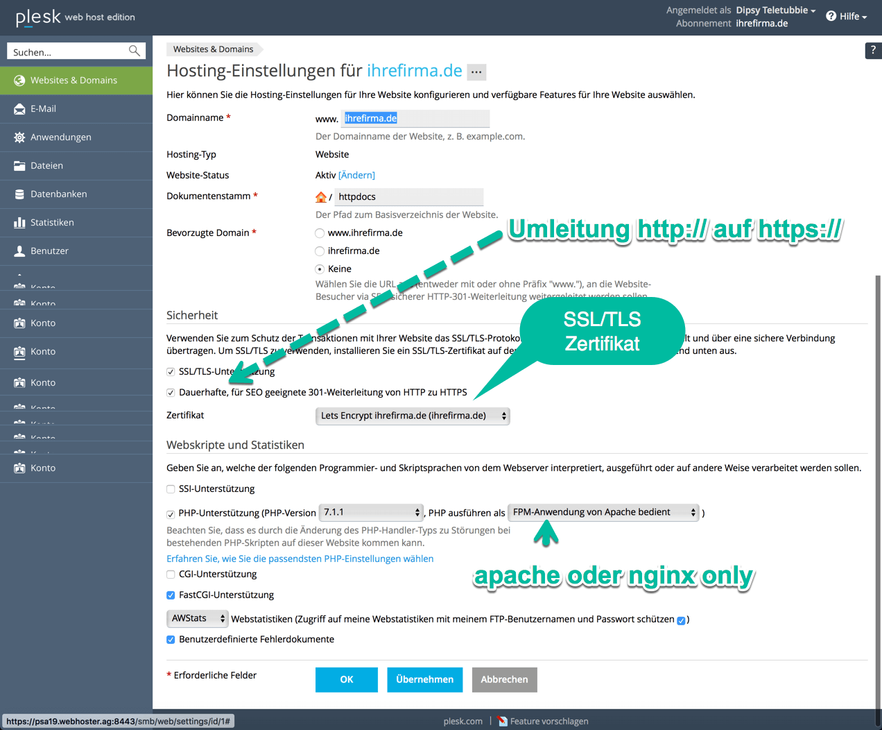 Sie haben hier auch die Möglichkeit die TLS Unterstützung zu aktivieren und ein passendes Zertifikat auszuwählen, sofern Sie schon eins eingerichtet haben. Mit der dauerhaften 301 Weiterleitung können Sie hier dann auch den Webserver automatisch alle Anfragen von http://ihrefirma.de auf https://ihrefirma.de umleiten.