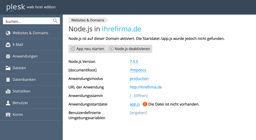 Mit node.js lassen sich serverseitig kleine Applikationen ausführen. Insbesondere eigene Webserver. Im Plesk können Sie die Apps direkt aktivieren, den Port definieren und die Anwendung konfigurieren. Bei Shared Hosting Accounts können Sie in der Regel keine separaten Ports öffnen, sodass Sie nur mit einer Proxy Umleitung im nginx auf den definierten Port zugreifen können.