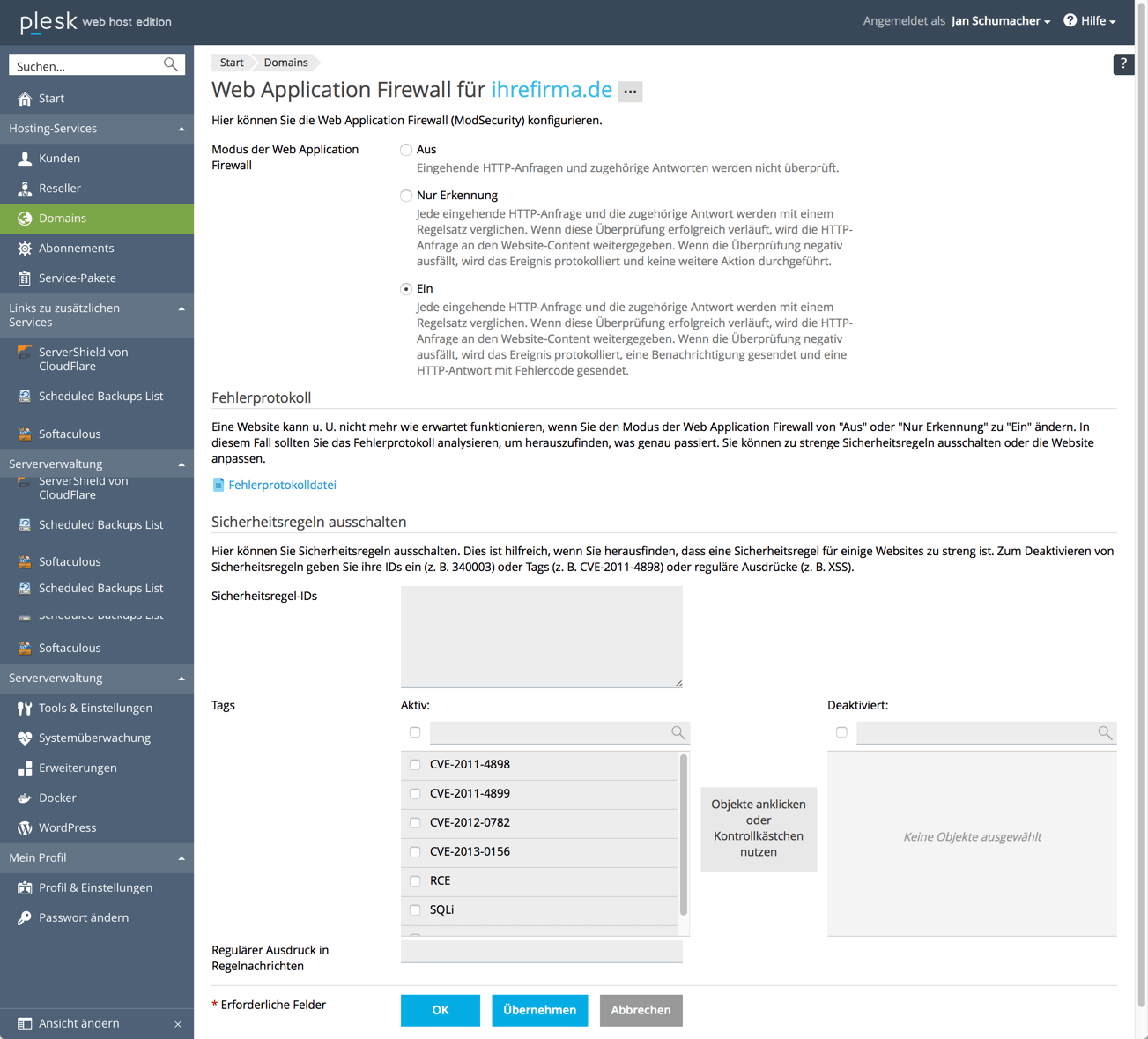 Die Web Application Firewall ist ein wirksamer Schutz Ihrer Internetseite vor Angriffen aus dem Internet. Es werden bestimmte Angriffsmuster erkannt und der Aufruf dann von der Firewall blockiert. Sie sollten diesen Schutz immer aktiviert lassen. Bei einigen älteren nicht aktualisierten CMS kann es zu Problemen kommen. In diesem Fall können Sie in den Protokollen (Error Log) nachsehen welche Firewallregel den Zugriff blockiert hat. Sie können einzelne Regeln freischalten oder im Extremfall natürlich auch die Firewall abschalten.