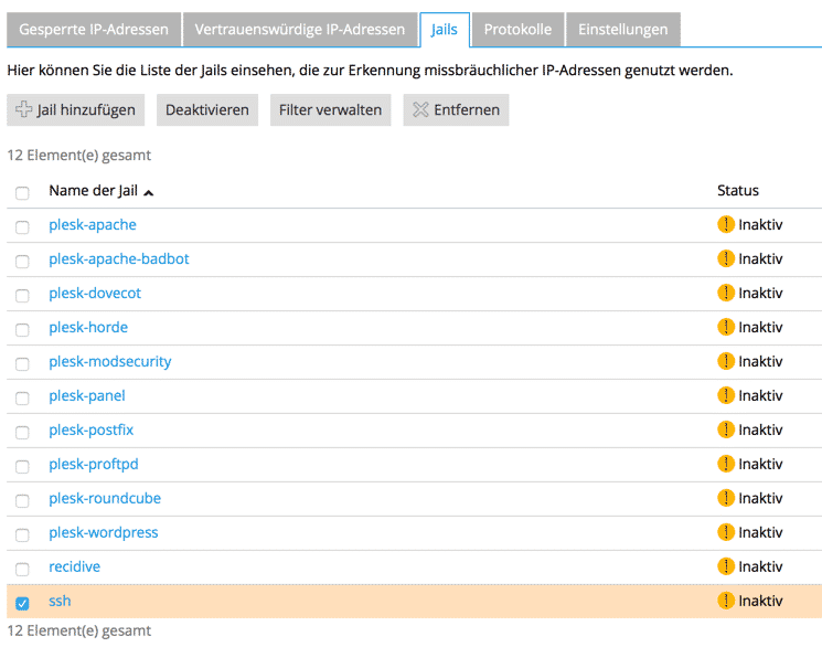 Für alle denen die Plesk Lizenz schon viel zu teuer ist, bietet sich mit fail2ban zumindest ein grundsätzlicher Standardschutz an der nichts kostet und über die Oberfläche zu verwalten ist.